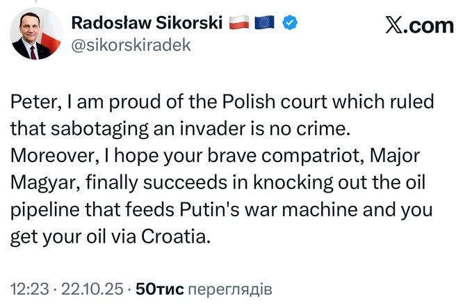 The real attacks on Romania and Hungary came just days after Europe essentially gave carte blanche for terror attacks across the EU by way of several top European officials openly condoning not only the Nord Stream attacks, but even attacks against Hungarian oil pipelines. Here Polish Foreign Minister Sikorski addresses Hungary’s Peter Szijjarto: